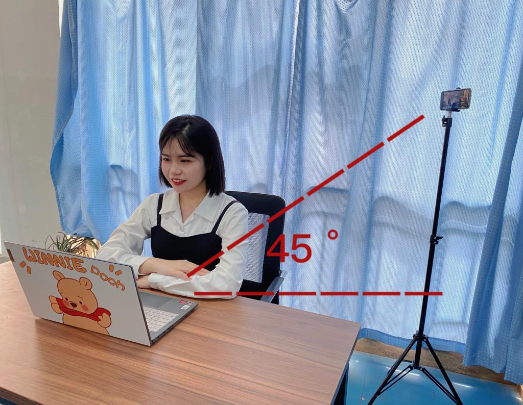 考生端采取“双机位”。“机位一”位于考生正前方。“机位二”位于考生侧后方45°。考生应把双手露出,“机位二”应能清晰的展示考生桌面情况和手部动作。具体示范图见下: