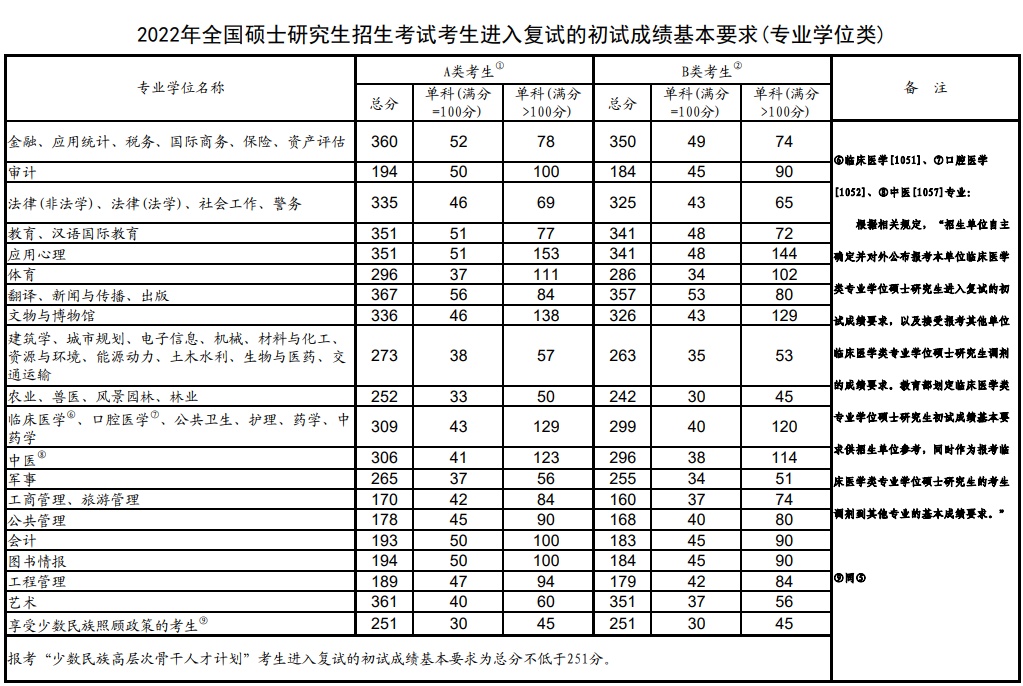 2022年全国硕士研究生招生考试考生进入复试的初试成绩基本要求
