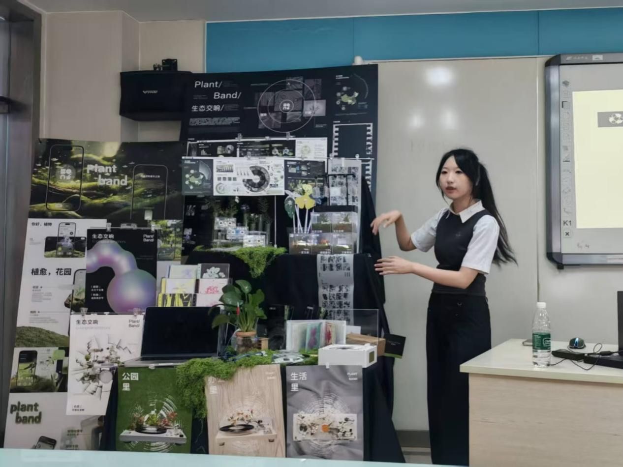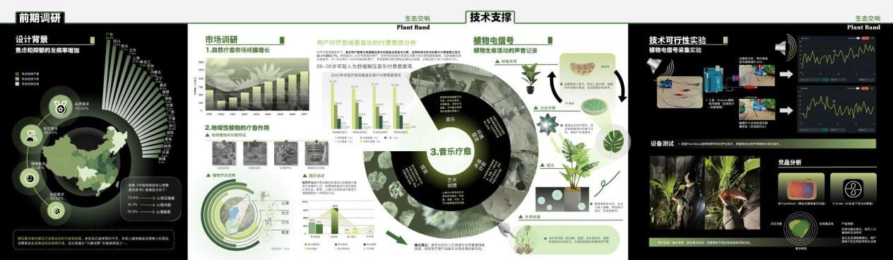 新技术应用领域,面对AIGC等技术变革带来的行业冲击,毕业生群体展现出清醒的技术自觉与创新勇气。视觉传达作品《生态交响——地域植物实验性交互设计》堪称技术融合的典范:团队以通感设计为理念,采集杭州地域植物的生物电信号与影像数据,通过TouchDesigner算法与Arduino传感器系统,构建植物电信号与音画交互的映射关系——不仅运用AIGC技术生成概念图形,更实现触碰植物时生物电信号实时转化为音频与视觉符号的交互体验。这种将生物传感技术、生成艺术与地域文化基因相融合的创作实践,既展现出驾驭前沿技术的工程能力,更彰显出在技术浪潮中守护文化根脉的设计担当。
