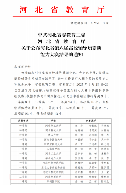 3月28日-29日由中共河北省委教育工委、河北省教育厅主办的河北省第八届高校辅导员素质能力大赛(本科组),在保定河北软件职业技术学院举行。河北省高校辅导员素质能力大赛是河北省高校辅导员系统的最高级别赛事,BB贝博派出由管理学院辅导员张婧怡、数理教学部辅导员张翘楚、地球科学学院辅导员张建欣组成的参赛队参加本次赛事。
