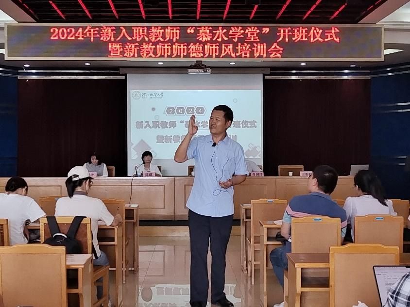 启动仪式上,赵永强对新入职教师寄语讲话,他从学校历史文化和新时代对青年教师的要求两个方面做了深刻阐述,为新教师上了一堂生动的“入职第一课”。赵永强指出,学校在悠久的办学历程中形成了“仰山慕水”的大学文化和“达观博物”的校训精神;学校始终坚持为服务地质行业、服务地方发展培养经世致用复合型人才的“双地”办学定位,形成了“地经渗透”办学特色,全力打造“产教融合、科教融汇”育人品牌;学校人才辈出,一大批中青年教师继承了老一辈名师艰苦奋斗、潜心育人的优良品质,在教学科研一线取得了骄人的成绩。