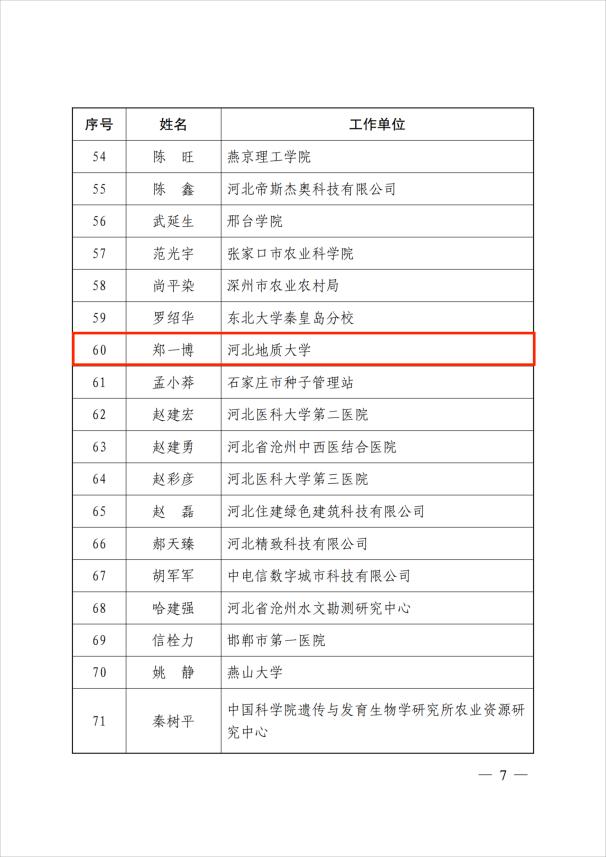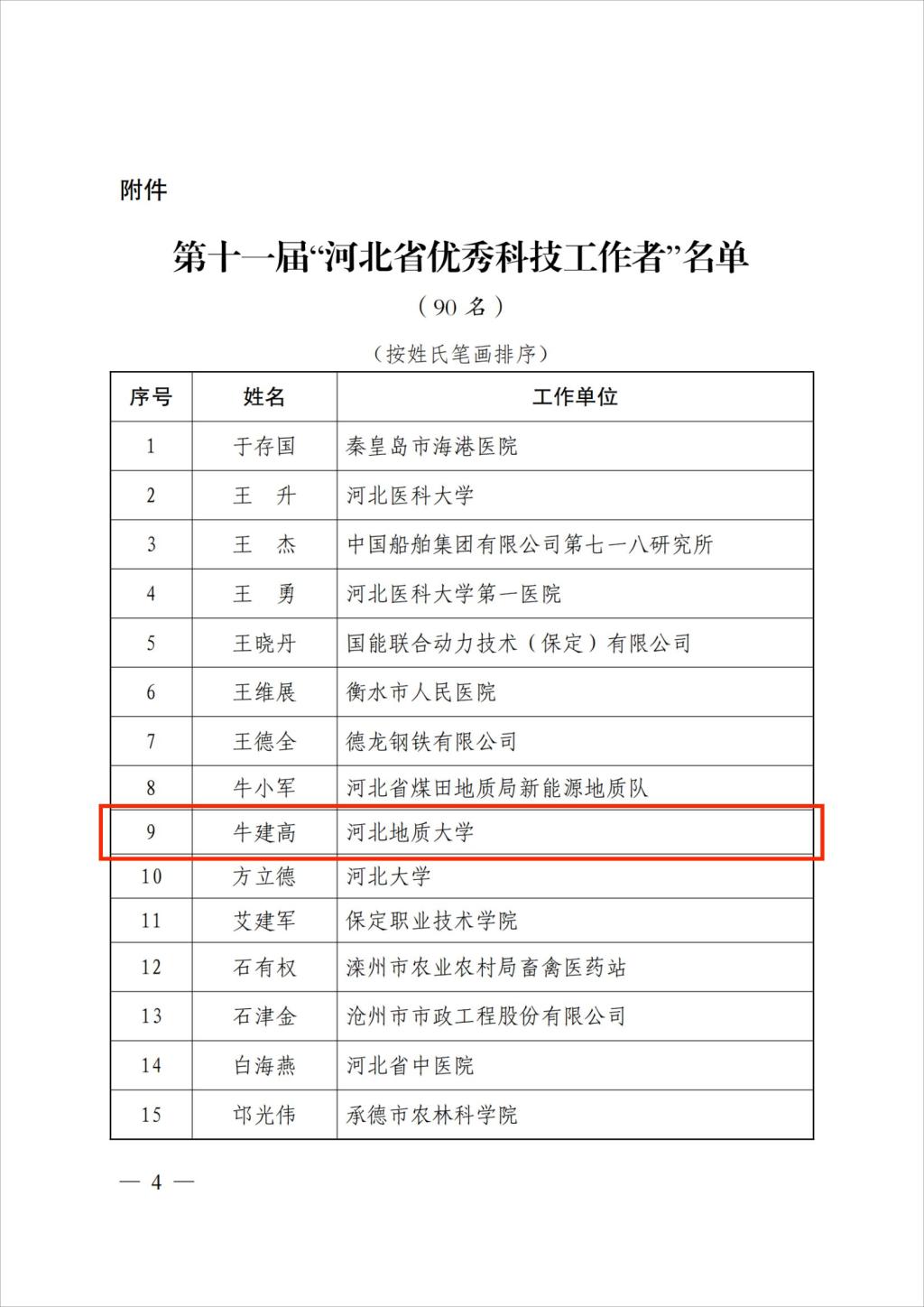 近日,中共河北省委组织部、河北省科学技术厅、河北省人力资源和社会保障厅、河北省科学技术协会联合下发《关于表彰第十一届“河北省优秀科技工作者”的决定》,BB贝博牛建高、郑一博、李杰、陆刚四名教师分别经河北省科学技术情报学会、河北省生物医学工程学会、河北省地质学会、河北省区域科学学会推荐参加评选,最终荣获第十一届“河北省优秀科技工作者”称号。