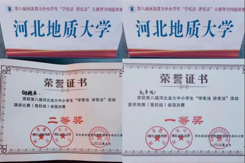 在第八届河北省大中小学生“学宪法 讲宪法”大赛中,法政学院2022级赵启悦、2021级向桓平分获素养竞赛(高校组)省级决赛一等奖和演讲比赛(高校组)省级决赛二等奖。