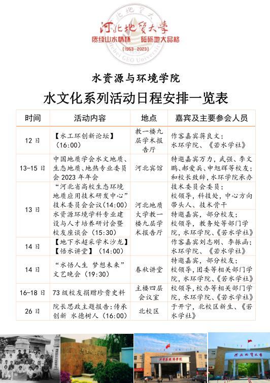“悟水讲堂”是《经典水故事》的重要源泉,也是课程思政建设的育人平台,承载着人才培养的期许和未来;10月底由仰山慕水办公室、若水学社联合主办的于开宁院长主题报告“传承创新 水德树人”与“庆典日”的十一月无缝衔接,正式开启“庆典模式”。迎庆典“资源环境+”水文化系列活动,内容丰富,形式多样,感悟到校友们的水情怀和大力支持。