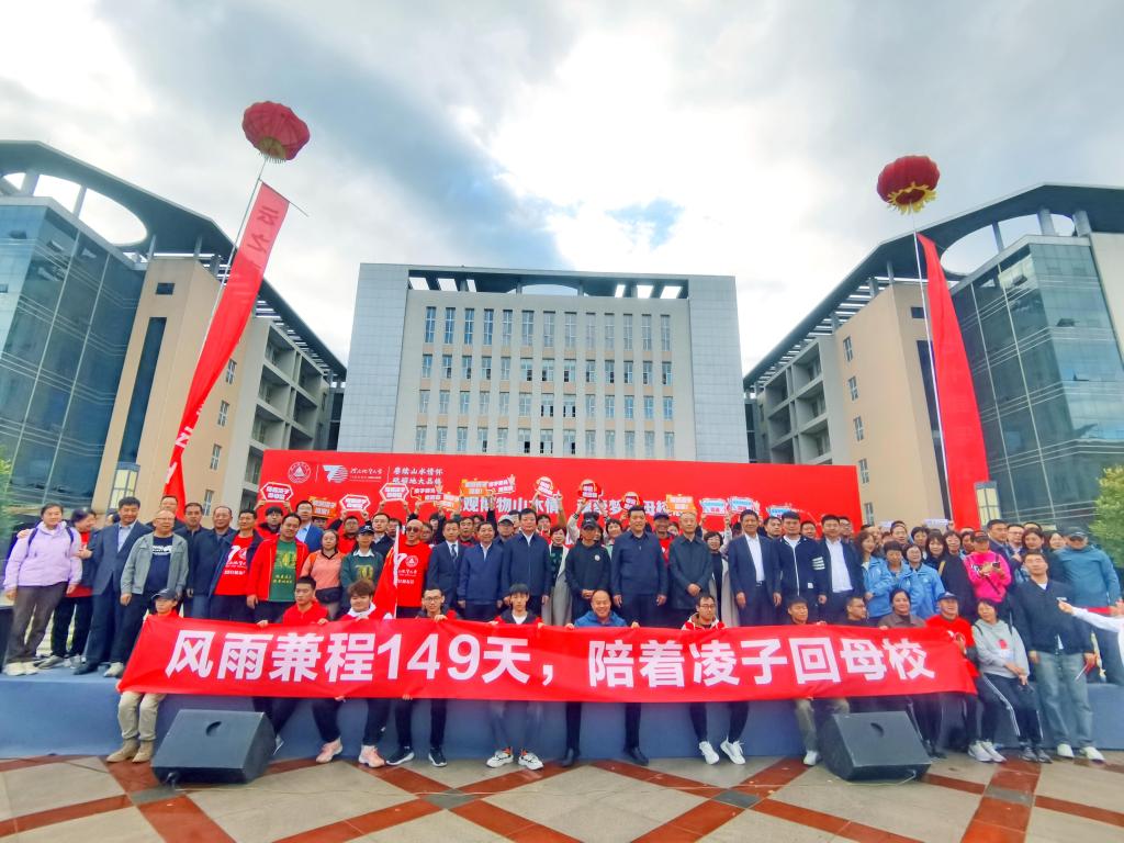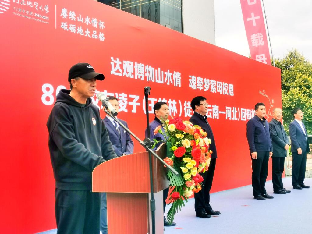 和志强致欢迎辞。他表示,“凌子”历经艰辛、披荆斩棘,徒步跨越了千山万水,用地质人的脚步丈量了祖国的大好河山,用学子的赤诚回馈了母校的培育之恩,用最简单的方式给予了我们最不平凡的感动。这次非凡的徒步之行,是“凌子”献给母校建校70周年的一份贺礼,更是他践行“达观博物”“仰山慕水”精神的生动写照,必将勉励我们地大人继续弘扬优良传统,传承地质精神,以只争朝夕的跋涉、敢闯敢试的勇气、坚韧不拔的定力,为党和人民的地质事业再立新功、再创佳绩。