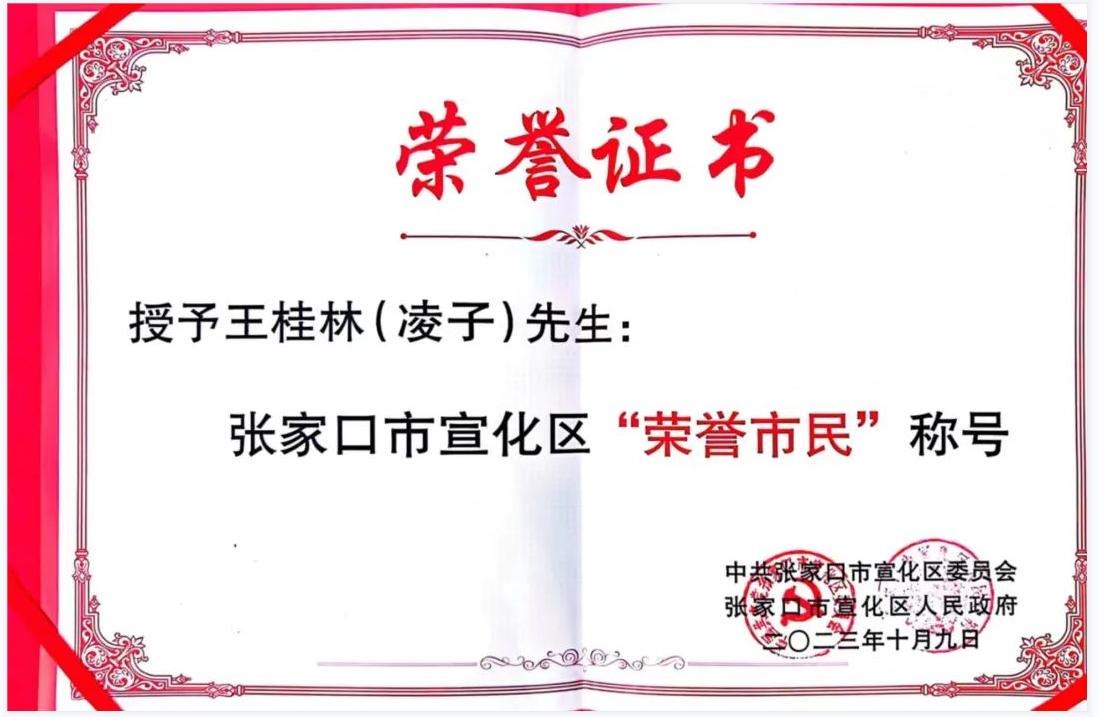 张聪为凌子颁发宣化区“荣誉市民”称号证书和宣化区“宣传大使”证书