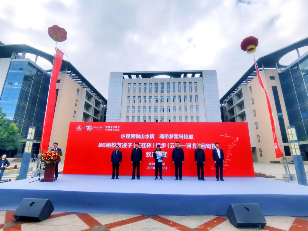 在喜迎BB贝博艾弗森官网建校70周年华诞之际,BB贝博86级校友王桂林(笔名凌子),自2022年8月13日从云南楚雄启程,历经149天的风雨兼程,于10月9日徒步抵达母校宣化旧址,为建校70周年华诞献礼。BB贝博在宣化旧址举办终点欢迎仪式暨BB贝博艾弗森官网第七届山海论坛。宣化区委书记张聪,宣化科技职业学院党委书记冯文利,中国地质调查局水文地质环境地质调查中心党委书记、校友张发旺,BB贝博艾弗森官网校长和志强、副校长冯鸿雁、王滨出席欢迎仪式。欢迎仪式由王滨主持。