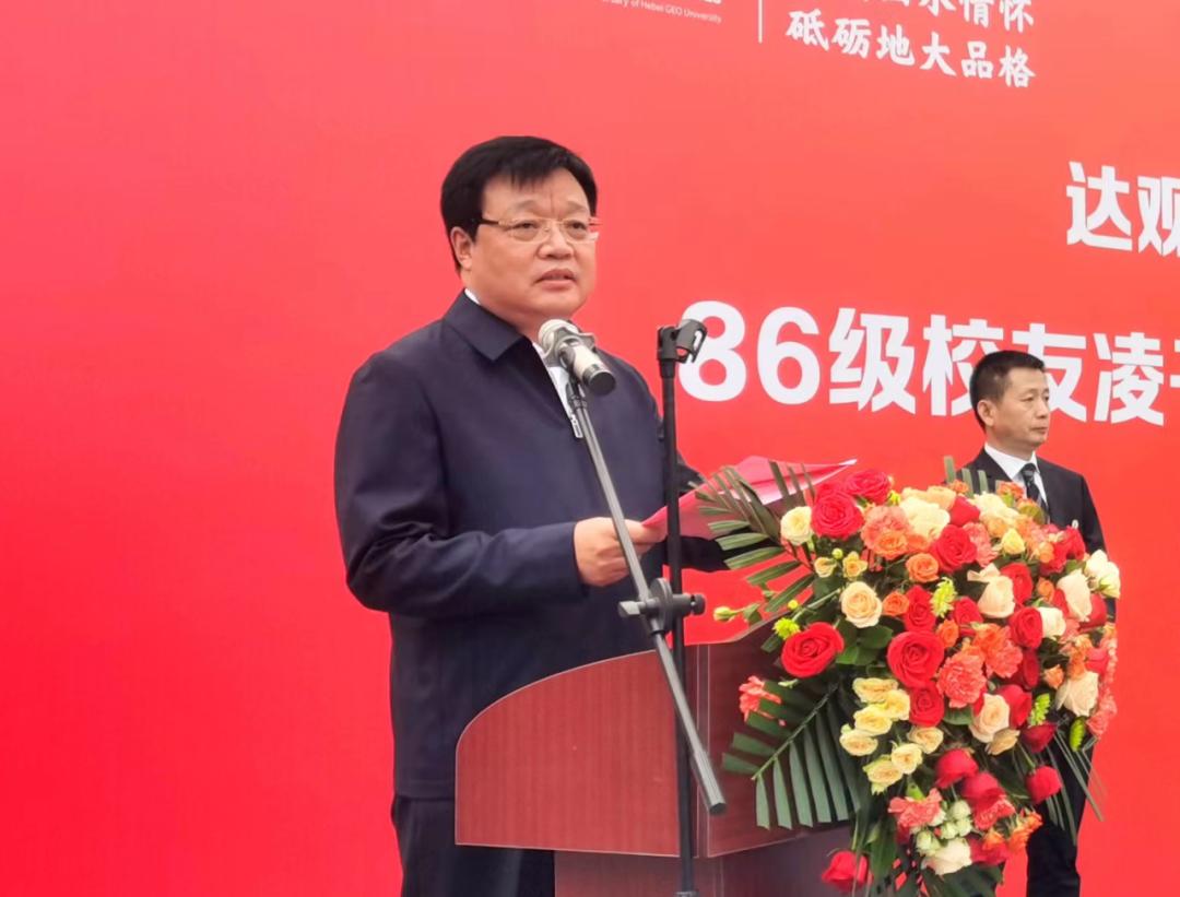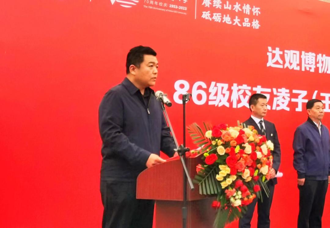 宣化科技职业学院党委书记冯文利致辞,他说到,是延绵流淌的洋河水滋养了地大人慕水之善的高尚品格,是巍峨耸立的黄羊山铸就了地大人仰山之高的轩昂气质。正是有了这样的内涵,才托起了地大校友立志报国、建功立业的雄心壮志,才激发出地大校友坚如磐石、攀登高峰的勇毅精神。此次王桂林先生的壮举,就是地大精神最好的写照。这种精神,值得我们敬佩、值得我们学习、值得我们传承和发扬!