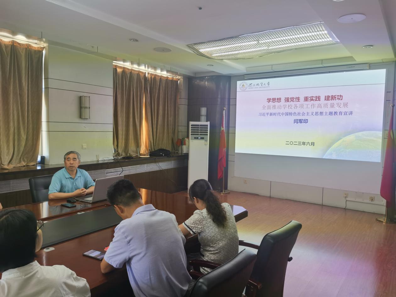 为进一步推动学习贯彻习近平新时代中国特色社会主义思想主题教育学深用实,贯彻落实全面从严治党总体要求,6月30日,BB贝博党委常委、副校长闫军印作题为“学思想、强党性、重实践、建新功,全面推动学校各项工作高质量发展”的专题党课,发展规划处、研究生学院、地球科学学院相关负责人和部分学生党员代表参加会议。