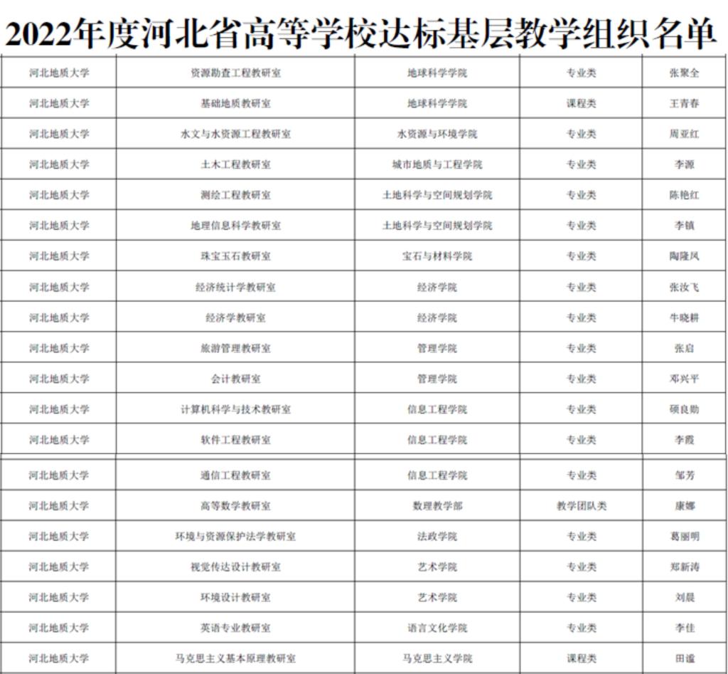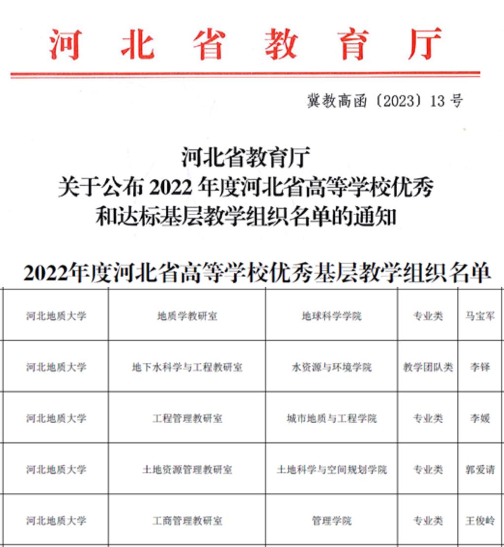 近日,河北省教育厅发布《关于公布2022年度河北省高等学校优秀和达标基层组织名单的通知》,BB贝博地质学教研室、地下水科学与工程教研室、工程管理教研室、土地资源管理教研室、工商管理教研室等5个基层教学组织获批首批河北省高等学校优秀基层教学组织,资源勘查工程教研室等20个基层教学组织获批为河北省高等学校达标基层教学组织。