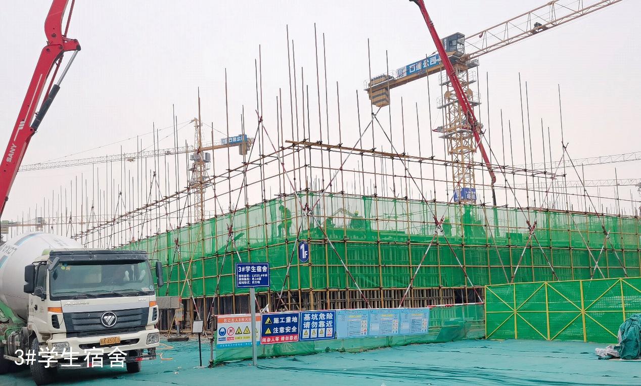 为加强施工进程的动态管理,学校组织校园规划建设处和相关部门的精干力量轮流驻扎新校区建设指挥部,加强与石家庄大学园公司现场管理人员的协调对接,现场监督施工工程进度、安全和质量,确保各项施工工序有效衔接和顺利完成,加快新校区工程施工建设效率。截至目前,新校区开工面积达到了17.1万平方米,除北部组团学生食堂顺利封顶外,地下车库已完成主体封顶,北部组团各学生宿舍楼和体育馆均建设至1层,综合办公楼和能源站完成基础垫层浇筑。
