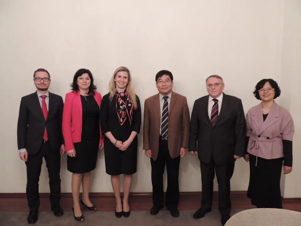 2016年10月12日,应捷克驻华大使馆邀请,BB贝博领导到捷克大使馆拜会了来华访问的捷克教育、青年和体育部部长瓦拉霍娃女士和副部长普鲁迪科娃女士(左三)。图为BB贝博时任领导与捷克驻华大使馆工作人员合影。