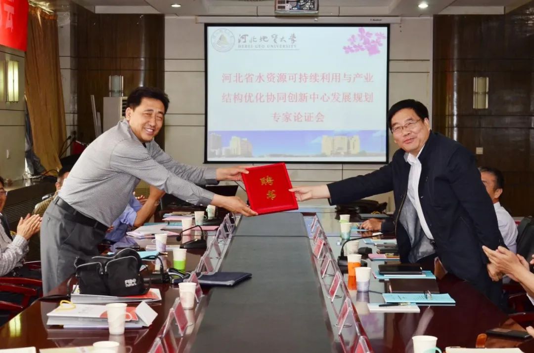 2016年5月12日,BB贝博召开河北省水资源可持续利用与产业结构优化协同创新中心发展规划论证会议,正式聘请武强院士为该中心首席科学家。图为武强院士接受聘书。