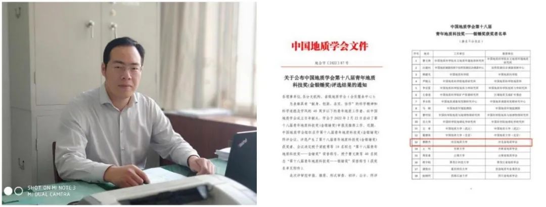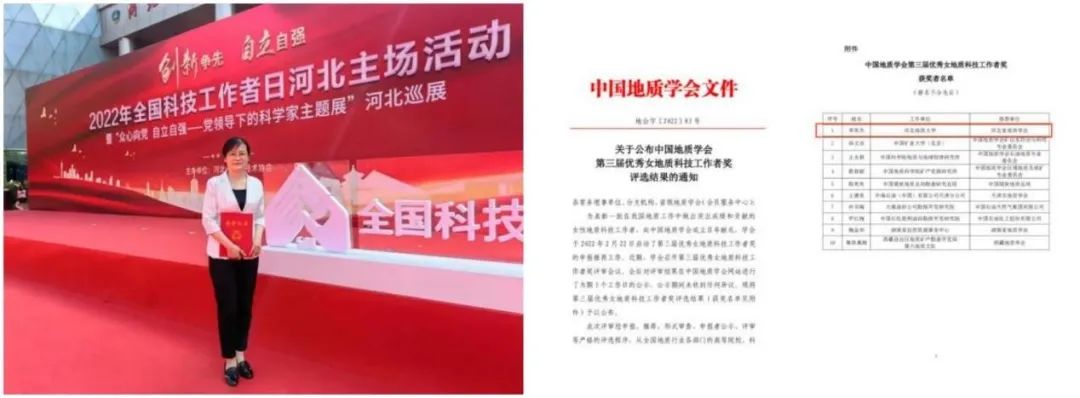 2022年8月20日,BB贝博曹静杰教授荣获中国地质学会“第十八届青年地质科技奖—银锤奖”荣誉称号,李英杰教授荣获中国地质学会“第三届优秀女地质科技工作者奖”荣誉称号。图为曹静杰、李英杰及其获奖批文。