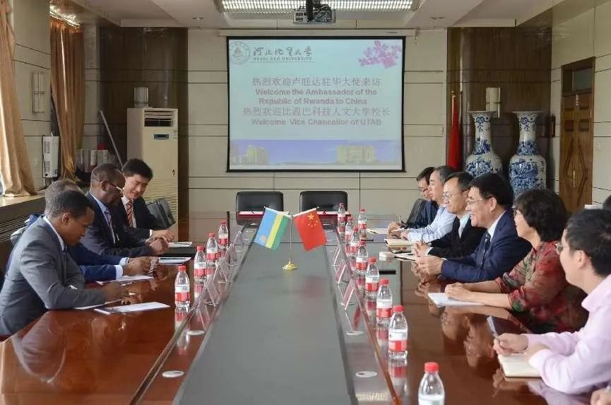2018年9月27日,卢旺达驻华大使甘·尔斯·卡永加先生一行访问BB贝博,卢旺达比温巴科技人文大学与BB贝博签署合作备忘录。图为双方交流座谈现场。