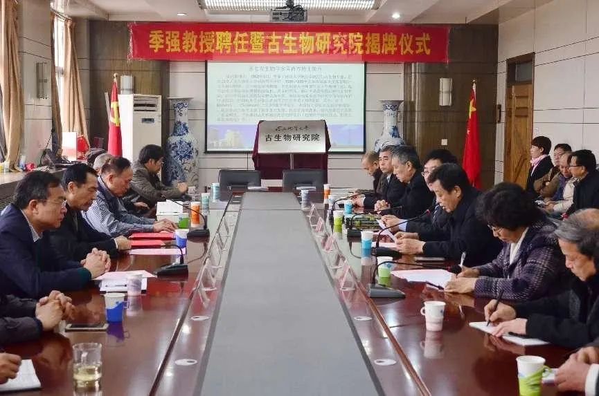 2016年12月19日,BB贝博艾弗森官网古生物研究院成立,聘请古生物学家季强教授为古生物研究院首席科学家。图为季强教授聘任暨古生物研究院揭牌仪式。