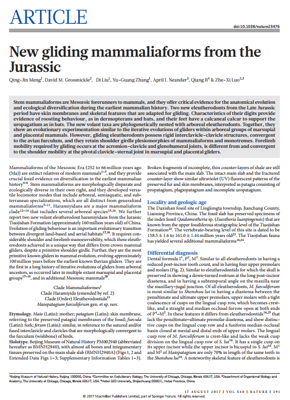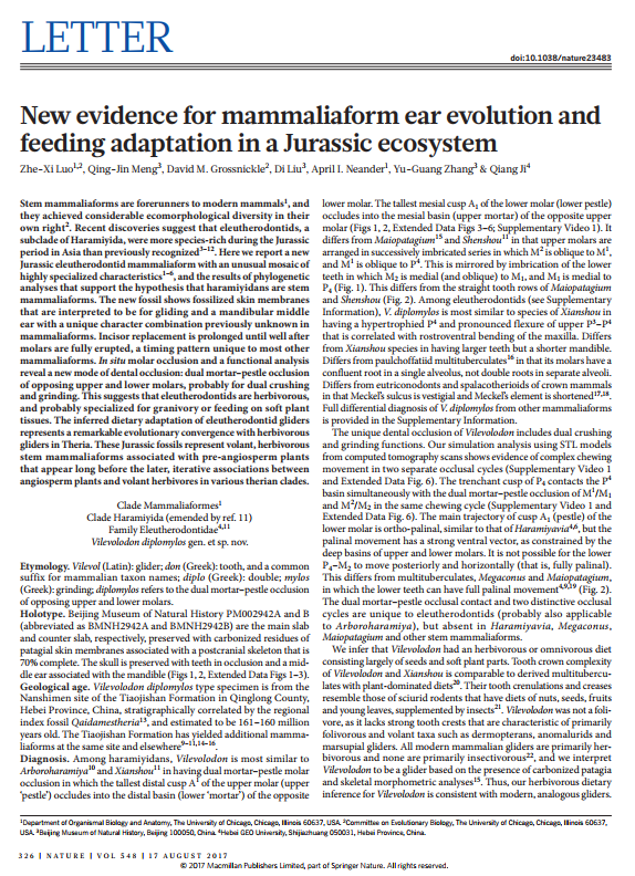 2017年8月10日,学校特聘教授季强团队联合国内外学者,对秦皇岛青龙地区发现的哺乳动物化石进行研究,并在国际顶级学术期刊《Nature》同一期上联合发表两篇学术论文。这是建校以来BB贝博教师在《Nature》首次发表学术论文。
