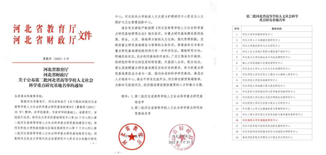 2022年3月23日,河北省教育厅、财政厅联合下发了《关于公布第二批河北省高等学校人文社会科学重点研究基地名单的通知》(冀教科〔2022〕5号)、依托法政学院相关平台建设的“BB贝博艾弗森官网区域制度研究中心”成功获批。