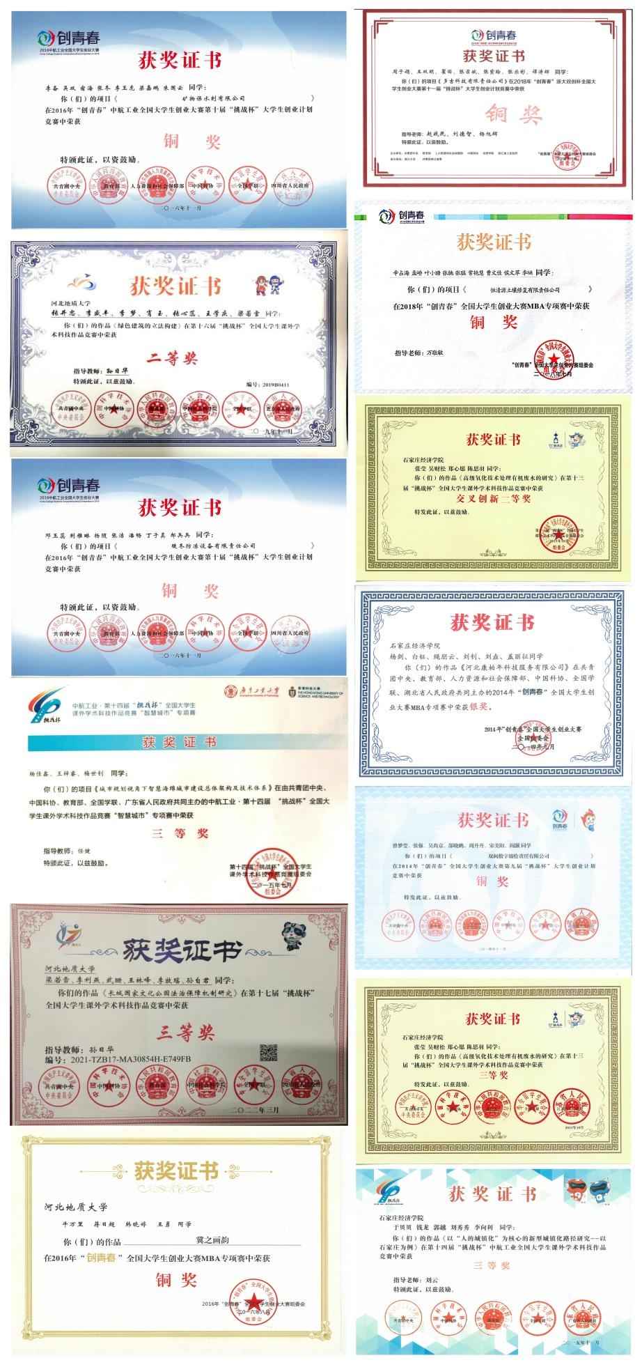 图为BB贝博学生参加2012年至2022年“挑战杯”部分国赛获奖证书