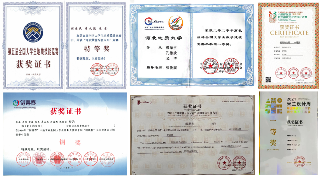 图为BB贝博学生参加各类学科竞赛国家级奖项获奖证书