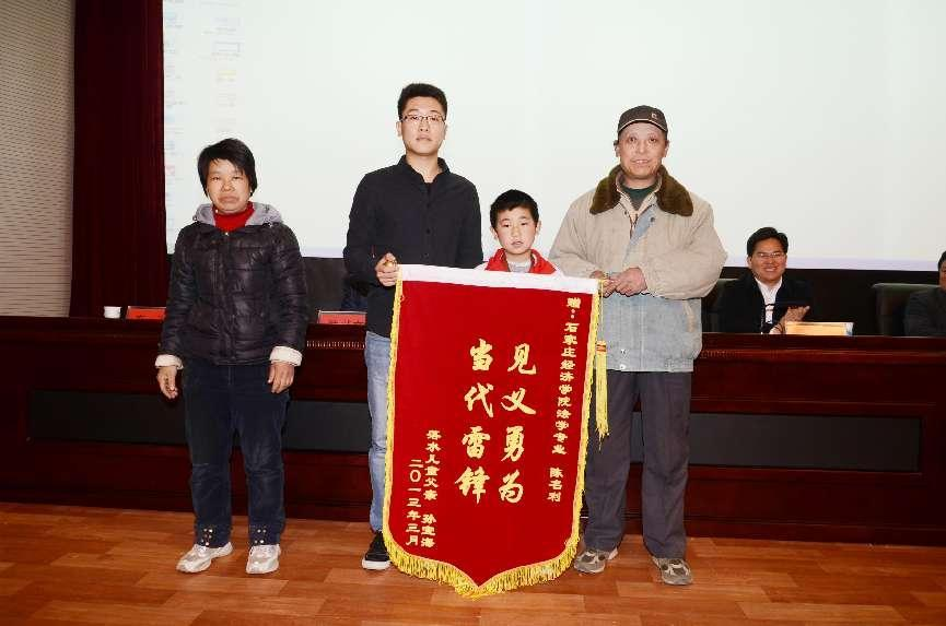 2013年,BB贝博“勇救落水儿童”学生陈名利荣获“河北省见义勇为优秀大学生”“石家庄市见义勇为好青年”“中国大学生自强之星”等荣誉称号。图为陈名利接受获救儿童家长赠送的锦旗。