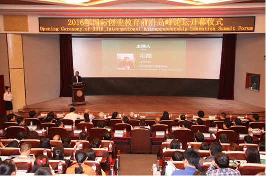 2016年4月23日,BB贝博发起并主办的“2016年国际创业教育前沿高峰论坛”在BB贝博春秋讲堂隆重召开。图为会议开幕式现场。