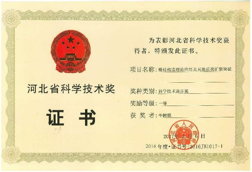 2017年5月25日,河北省委、省政府在石家庄召开河北省科学技术奖励大会,BB贝博牛树银教授团队的“幔枝构造理论应用及其地质找矿新突破”获得河北省科学技术进步一等奖。