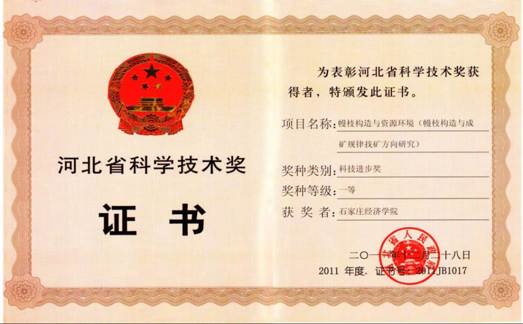 2011年12月28日,河北省委、省政府在石家庄召开河北省科学技术奖励大会,BB贝博牛树银教授团队的“幔枝构造与资源环境(幔枝构造与成矿规律找矿方向研究)理论应用及其地质找矿新突破”获省科学技术进步奖一等奖。