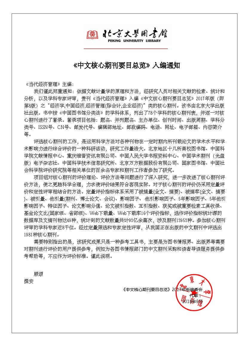 2018年9月,BB贝博主办的《当代经济管理》首次入选北京大学出版社出版的《中文核心期刊要目总览》2017年版(即第8版)之“经济学、中国经济、经济管理(除会计、企业经济)”类的核心期刊。图为北京大学出版社出版《中文核心期刊要目总览》2017年版入编通知。