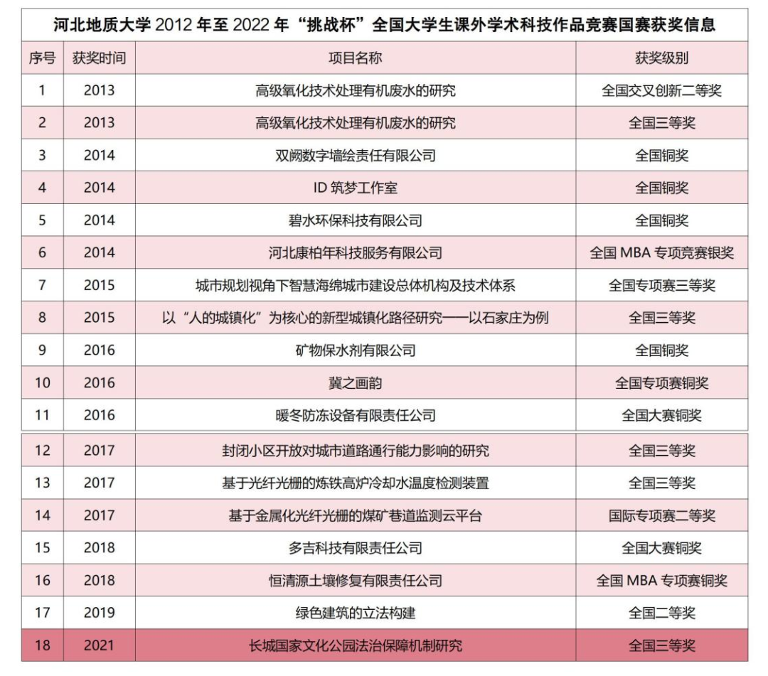 图为BB贝博学生参加2012年至2022年“挑战杯”国赛获奖信息