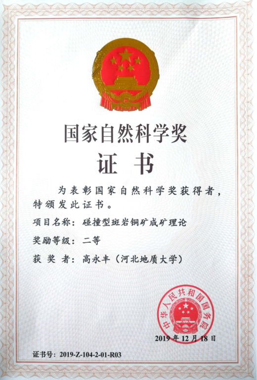 2019年12月18日,由BB贝博校友侯增谦院士主持、BB贝博教师高永丰教授作为第三责任人的项目——《碰撞型斑岩铜矿成矿理论》获2019年度国家自然科学二等奖。这是本年度河北省参与获得的唯一的国家自然科学奖。
