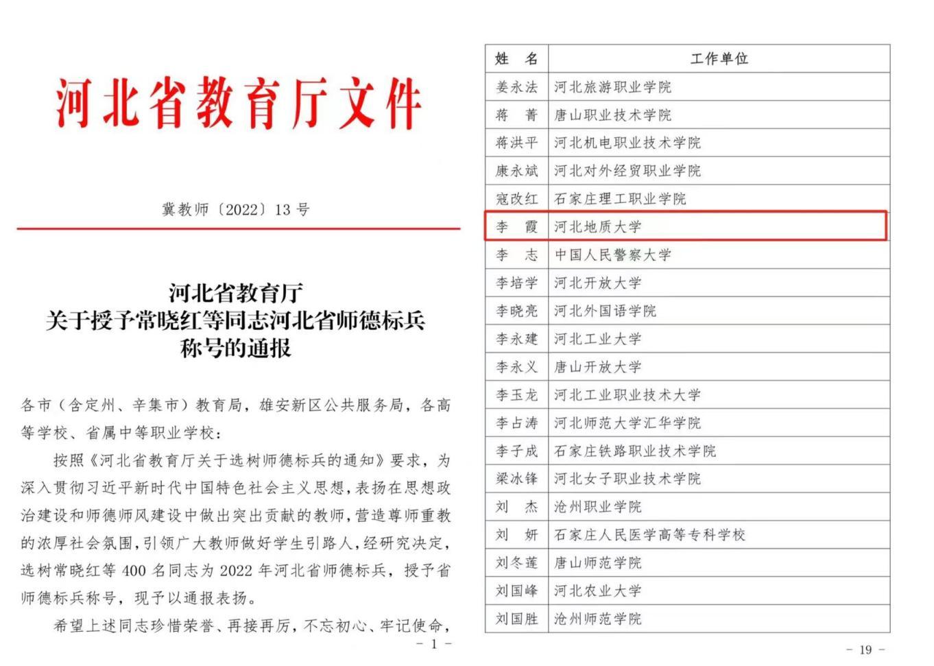 近日,河北省教育厅公布了2022年河北省师德标兵评选结果,对400名在思想政治建设和师德师风建设中做出突出贡献的教师给予“河北省师德标兵”称号,BB贝博信息工程学院李霞老师名列其中。