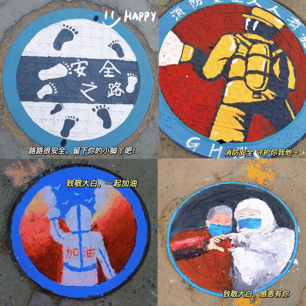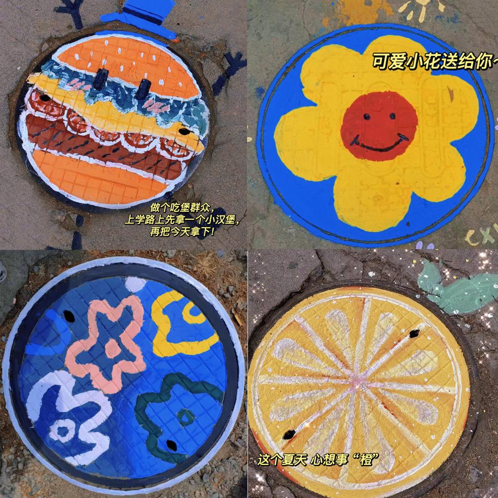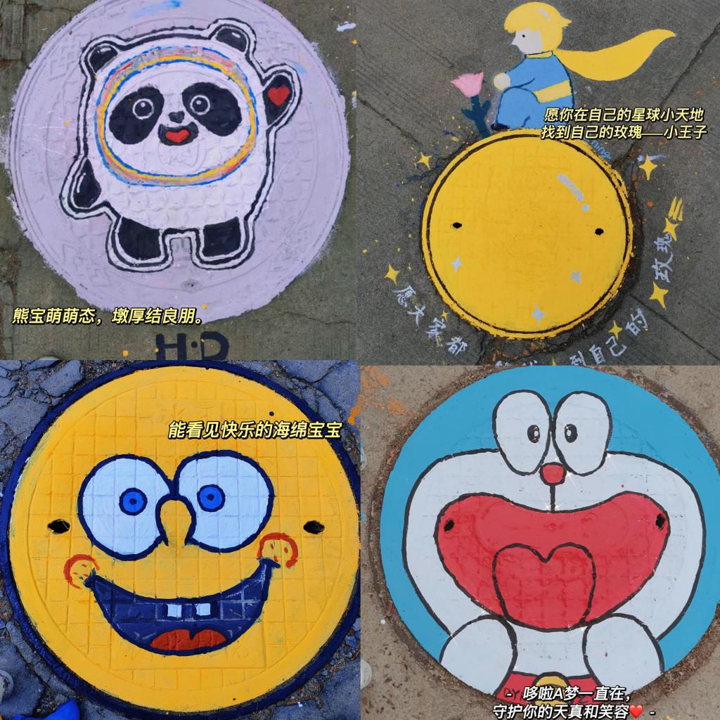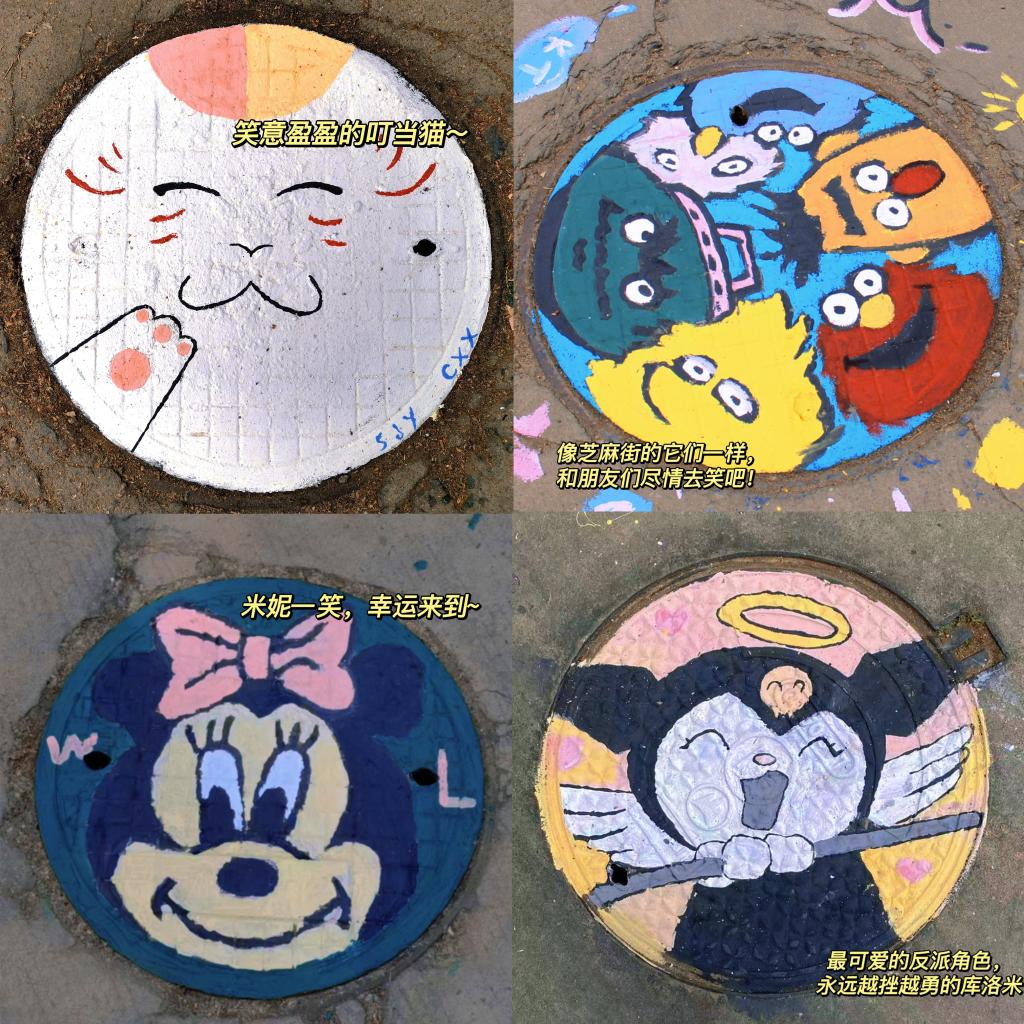 漫步校园,你会发现脚下的小惊喜,冰墩墩憨态可掬,叮当猫笑意盈盈,小王子找到了自己的玫瑰,还有快乐的海绵宝宝,守护我们天真和笑容的哆啦A梦,画给我们每一个人的心想事“橙”等等卡通人物。学生们用画作致敬“大白”,还有学校各个岗位默默付出的每一个人。这些落户小小井盖的创意作品为春日的校园里锦上添花,成为一道独特靓丽的风景线。