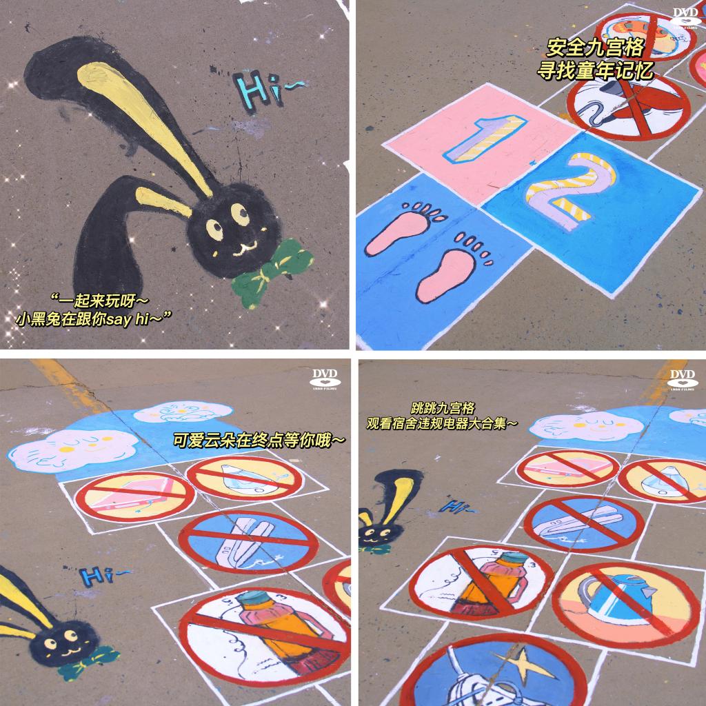 在大家驻足欣赏拍照的同时,安全元素始终贯穿融入其中,学生们把日常安全用电注意事项画成了童年记忆里的跳格子游戏,旁边可爱小黑兔俏皮的跟大家打着招呼,把安全教育以学生喜闻乐见的形式呈现,提升了常态化教育的温度和效果。
