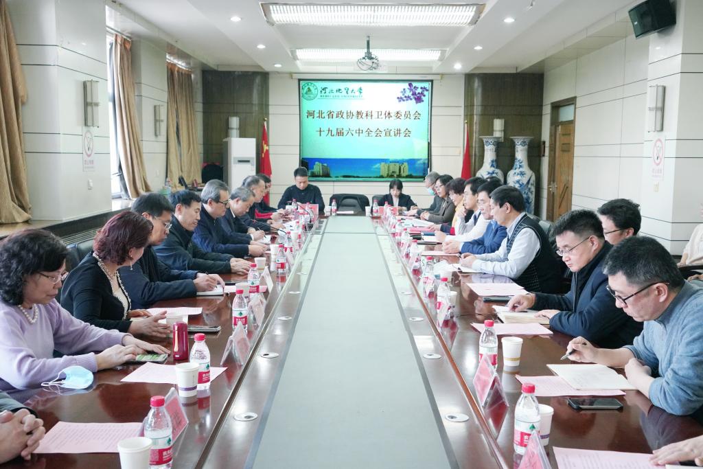 12月20日下午,河北省政协常委、教科卫体委员会主任栗建华一行来BB贝博作学习贯彻党的十九届六中全会精神宣讲报告。BB贝博省市人大代表、政协委员、民主党派负责人、统战部负责人参加了报告会。省政协教科卫体委员会二级巡视员尚根树主持报告会。