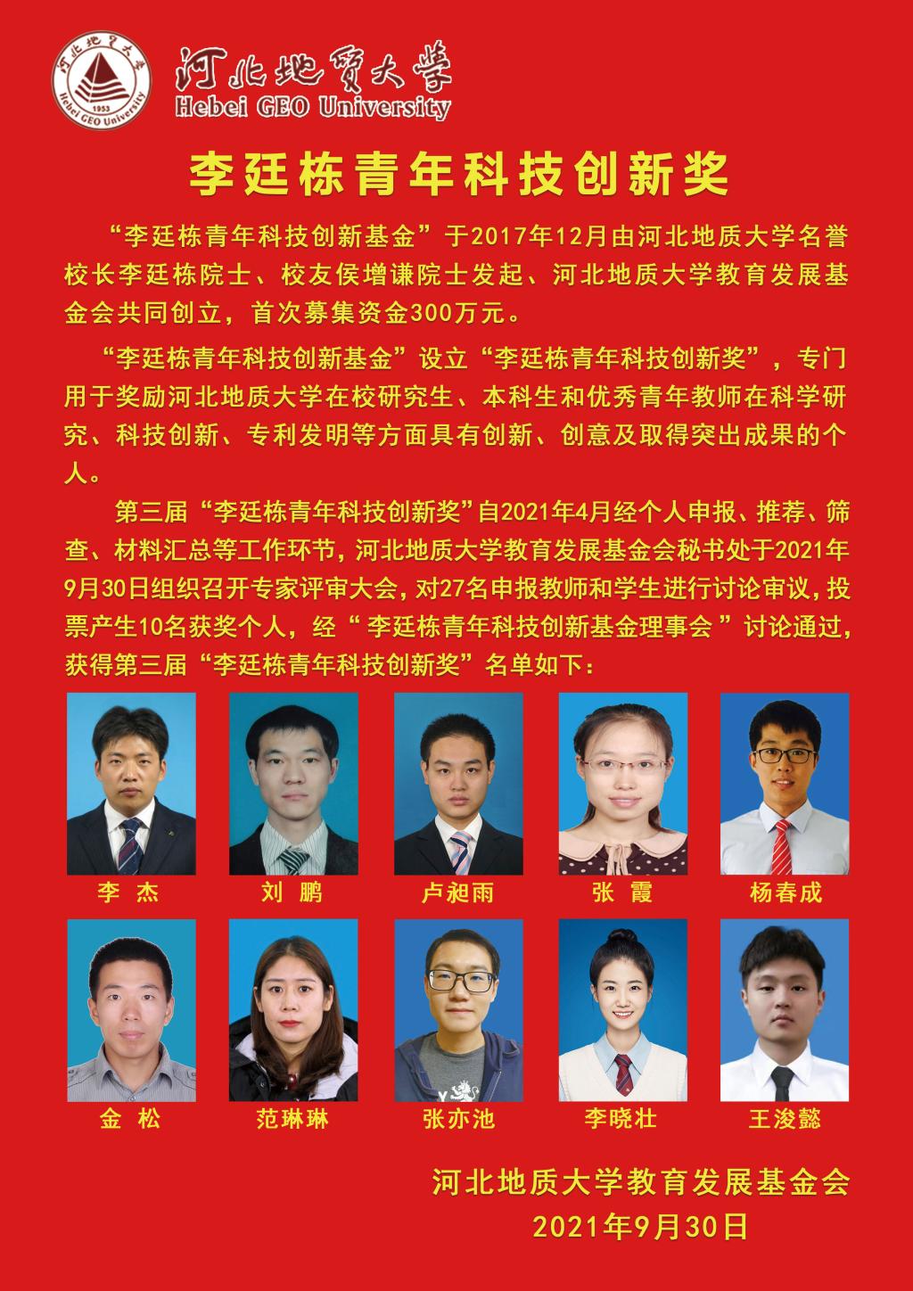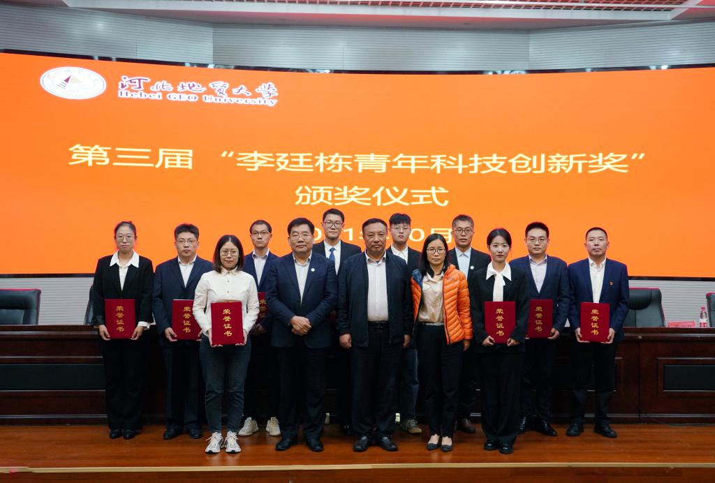 10月6日下午,由BB贝博名誉校长李廷栋院士、杰出校友侯增谦院士发起的“李廷栋青年科技创新奖”,经过严格的评选程序,产生了第三届优秀获奖师生,他们是:李杰、刘鹏、卢昶雨、张霞、杨春成五位教师和金松、范琳琳、张亦池、李晓壮、王浚懿五位同学。侯增谦院士莅临BB贝博,专程为获奖者颁奖,李廷栋院士妹妹李晓华女士宣读李廷栋院士贺信。校长王凤鸣出席颁奖仪式并发表讲话。副校长王滨主持颁奖仪式。