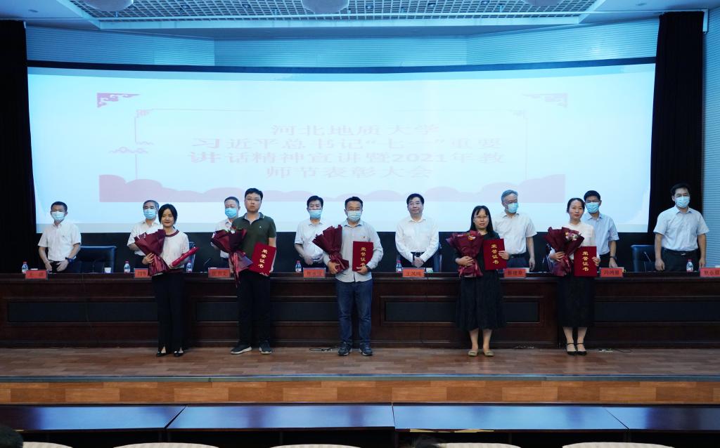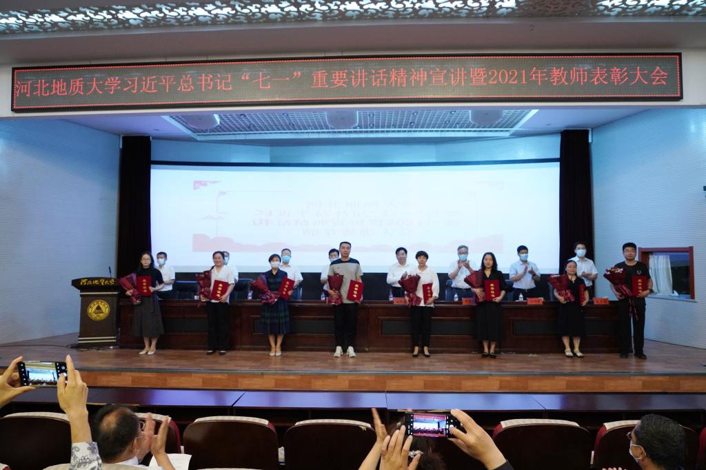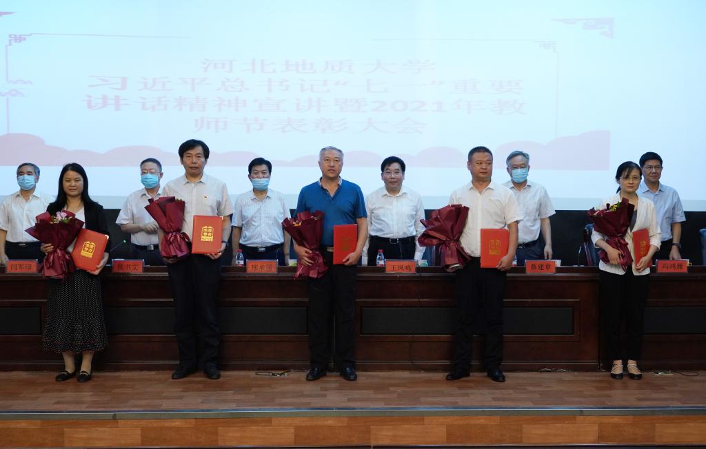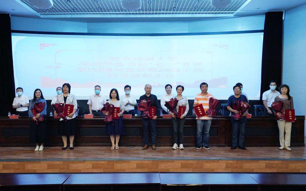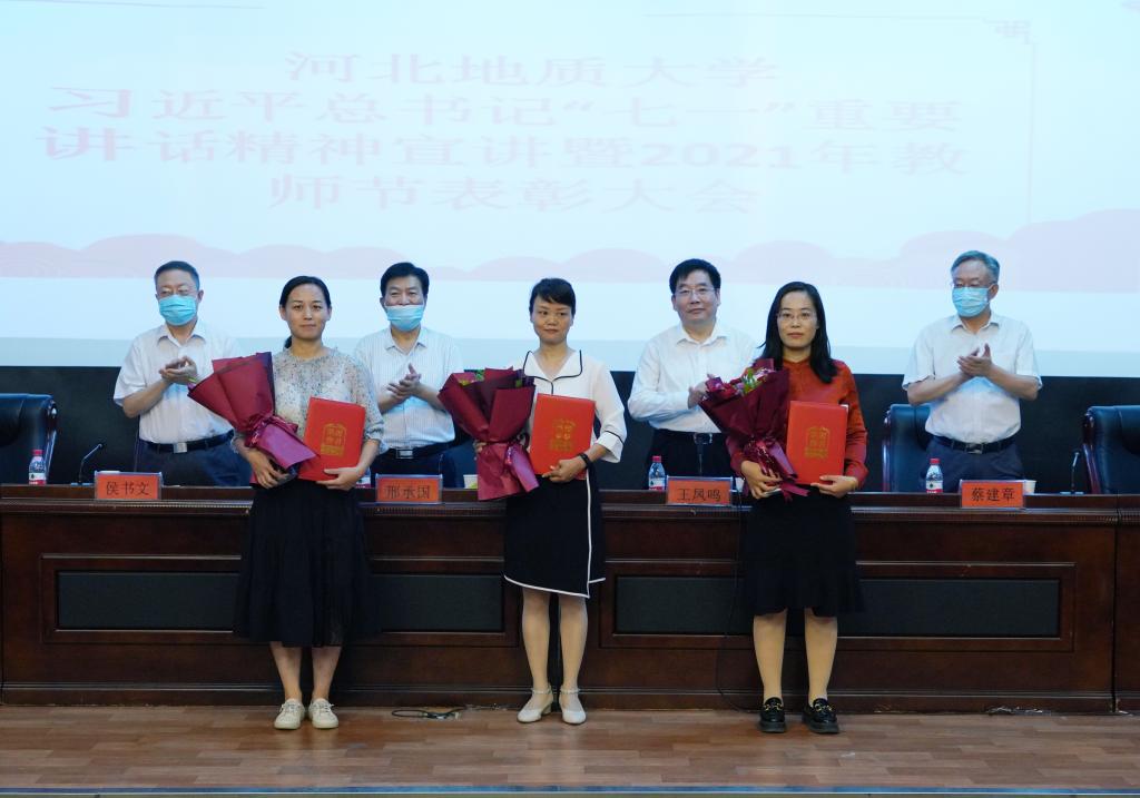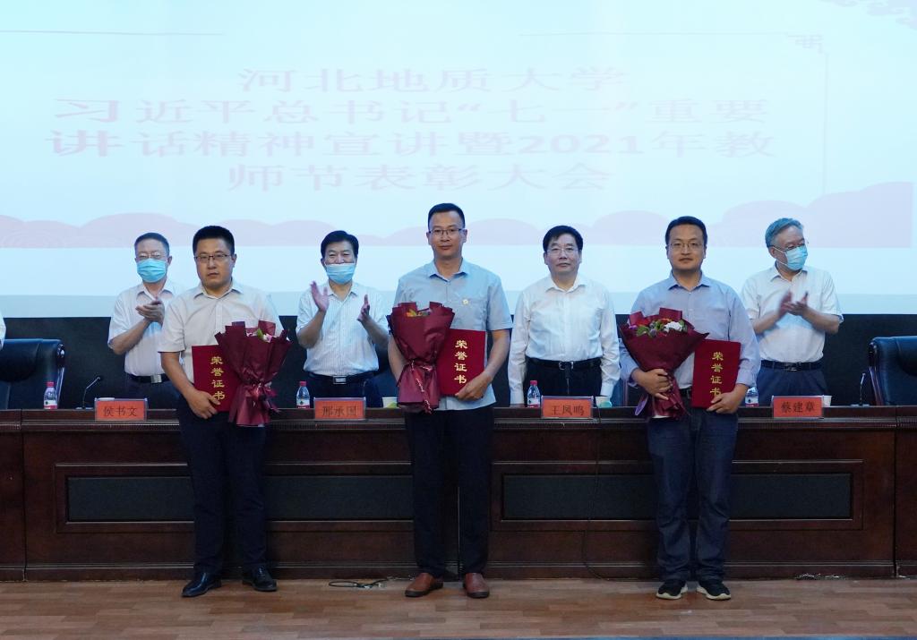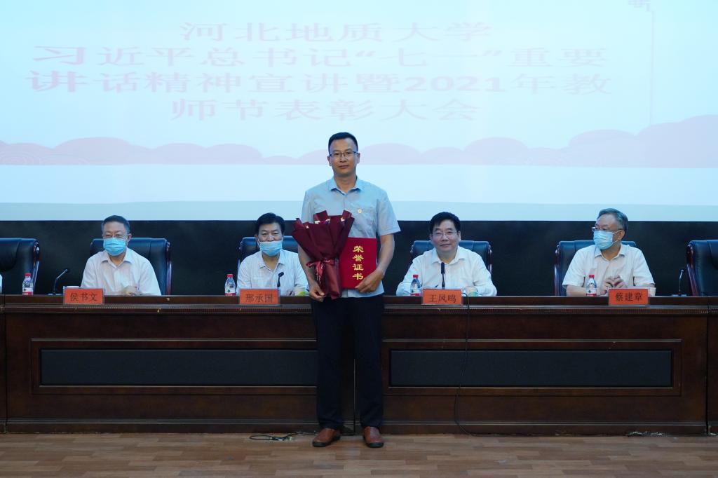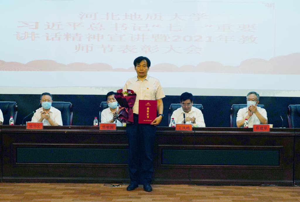 党委书记邢承国为“全国高校黄大年式教师团队”负责人、土地科学与空间规划学院院长尚国琲颁奖。其他校领导分别为获奖教师颁发了荣誉证书,新入职教师代表赠送了鲜花。