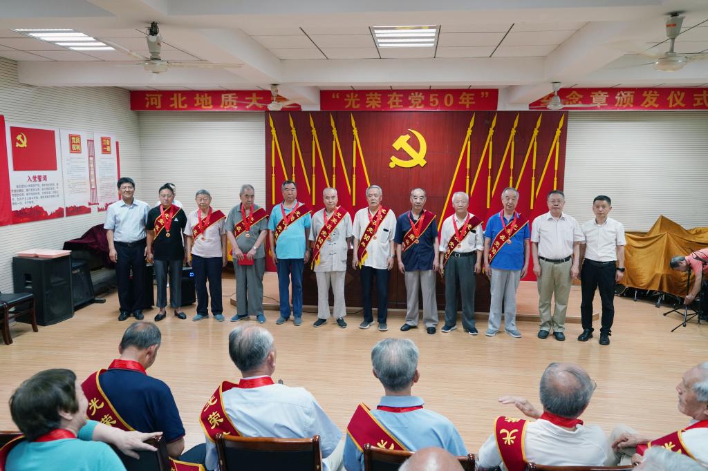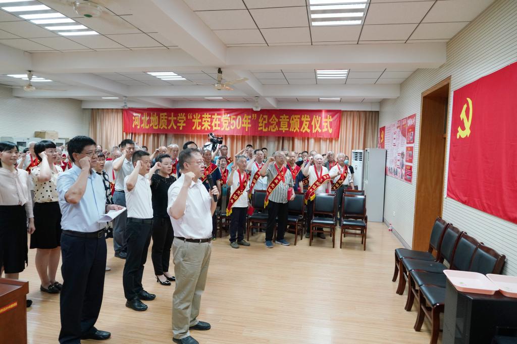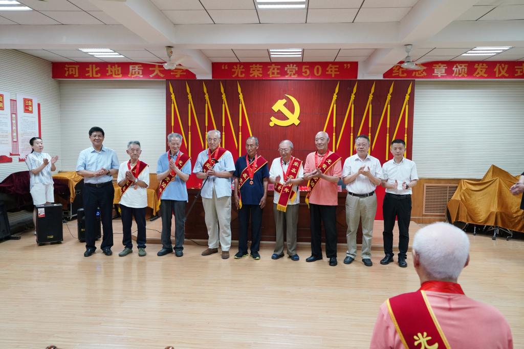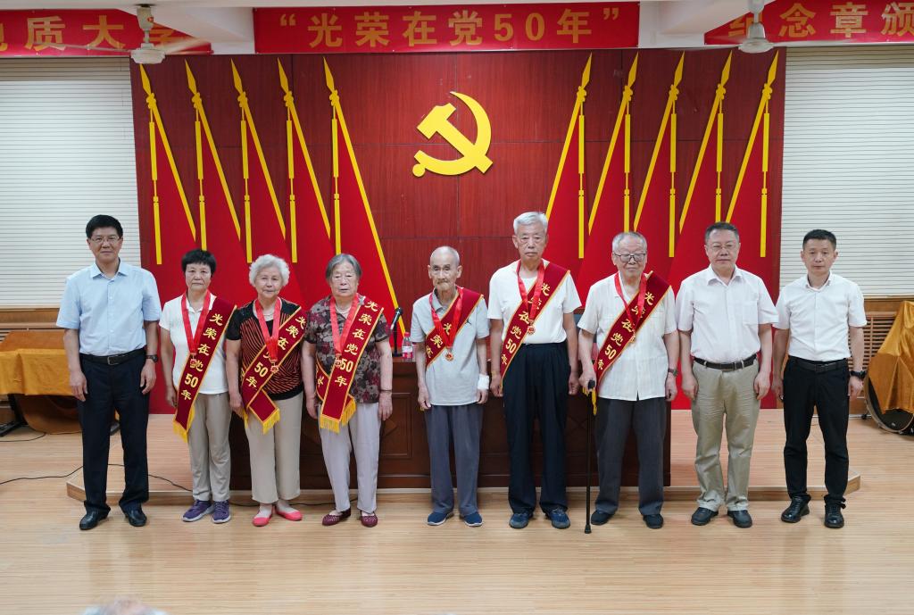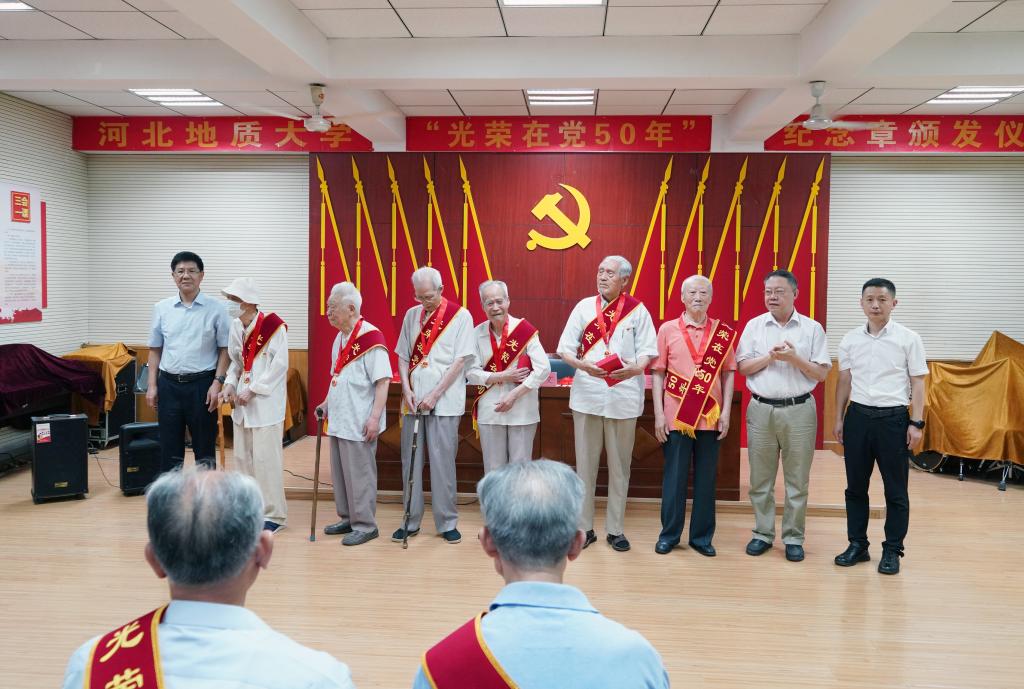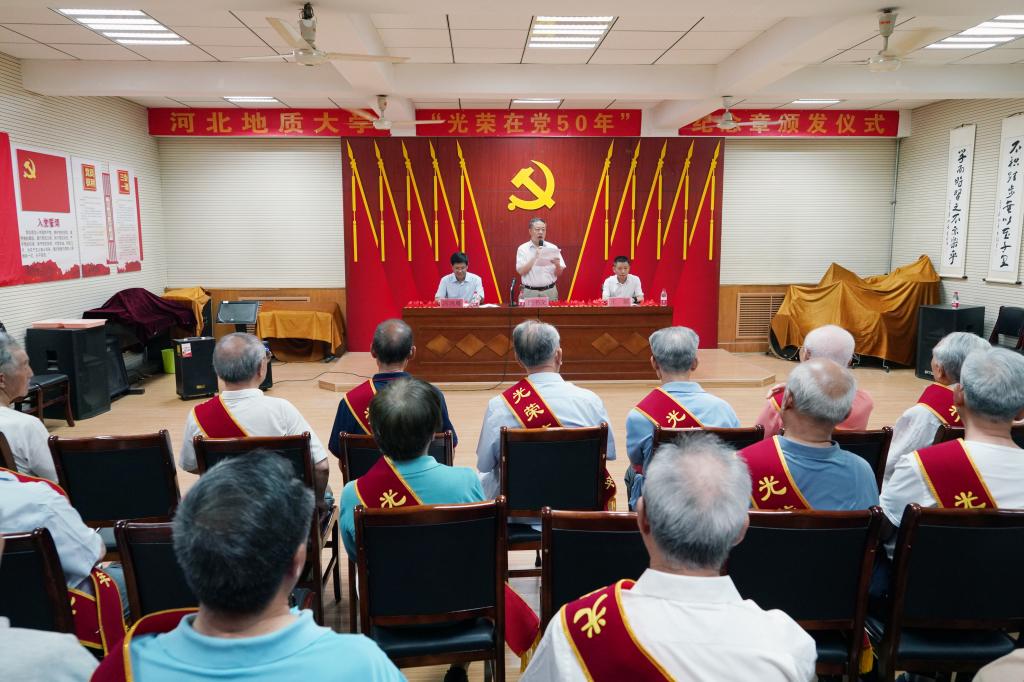 与会校领导一一为老党员佩戴“光荣在党50年”纪念章并向他们致以崇高的敬意