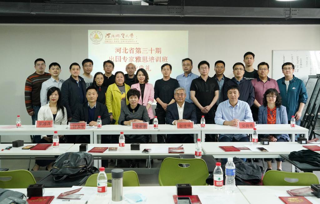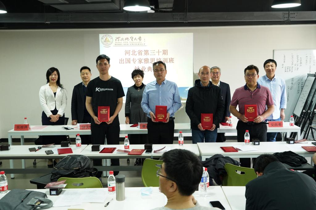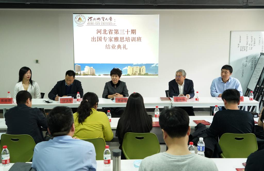 4月29日下午,由河北省人力资源和社会保障厅主办,BB贝博承办的河北省第三十期出国专家英语雅思培训班结业典礼在BB贝博举行。省人力资源和社会保障厅专家与留学人员服务中心主任赵进华、石家庄信息工程职业学院副院长黄淑敏、BB贝博艾弗森官网国际交流合作处处长付天军、石家庄信息工程职业学院外语教育培训部主任张桂萍、BB贝博艾弗森官网语言文化学院副院长安尚勇出席结业典礼。