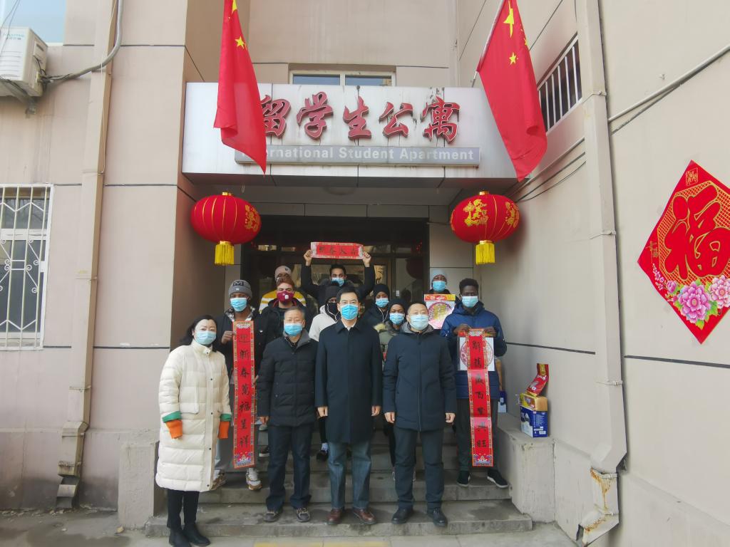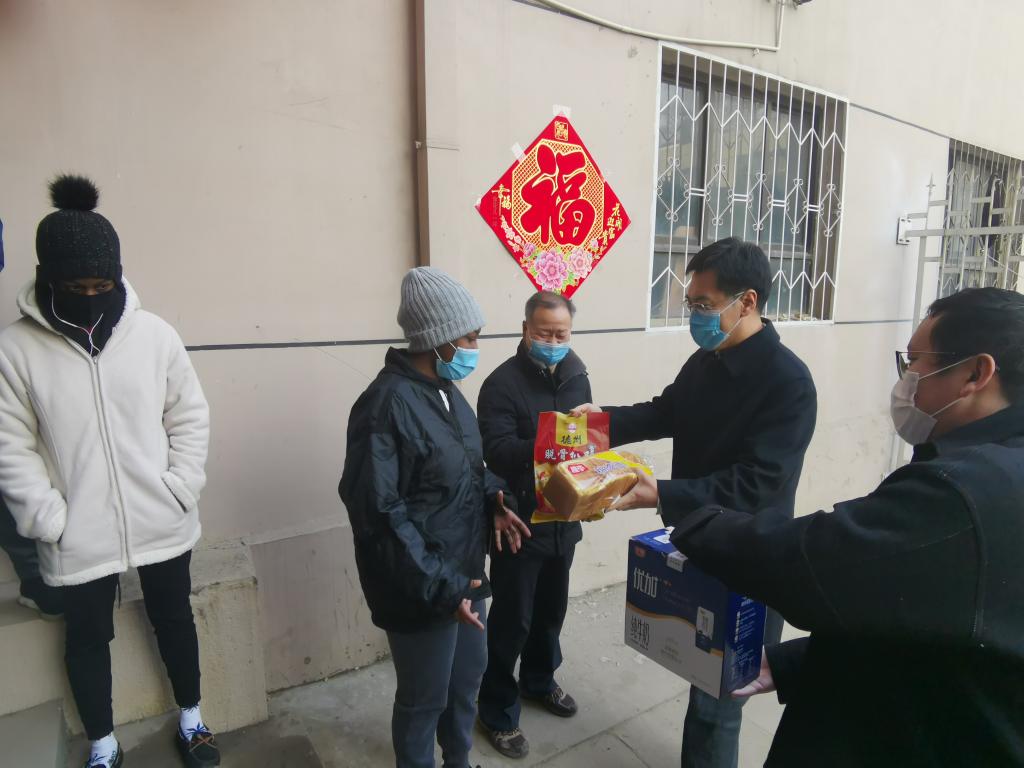 在留学生公寓楼前,赵永强一行看望慰问了BB贝博留学生,为留学生送去了新春礼包,并代表学校感谢同学们对中国抗疫工作的大力支持与积极配合,希望同学们在新的一年里学业有成,继续当好中外友谊的使者,为家乡建设贡献力量。同时,赵永强还慰问了留守在留学生公寓的宿管工作人员,并代表学校感谢他们“舍小家、为大家”的无私奉献,祝愿大家新春佳节幸福安康。