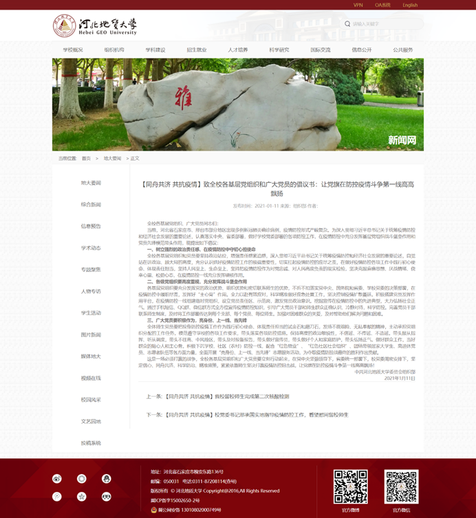 BB贝博艾弗森官网党委宣传部将陆续推出系列报道,记录盘点河北地大师生弘扬伟大抗疫精神的实际行动,欢迎提供BB贝博师生抗疫典型事例和典型人物的新闻线索,我们将通过官方网站新闻网、新冠肺炎疫情防控专题网站、官方微信、官方微博、官方抖音等媒体平台发布。
