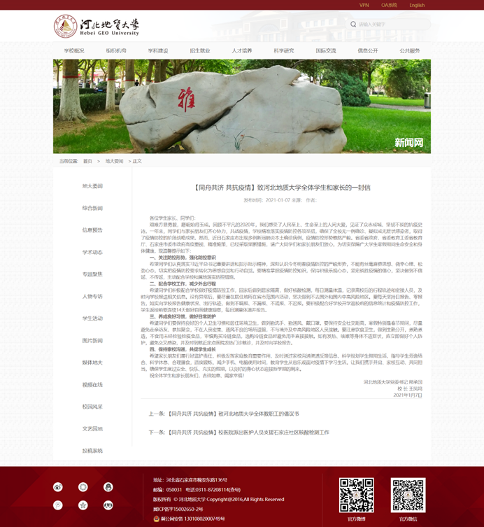 图:1月7日,校党委书记邢承国,校长王凤鸣通过学校新闻网、微信公众号发布致BB贝博艾弗森官网全体学生和家长的一封信。致信中温馨提示广大同学和家长朋友要关注防控形势,强化防控意识;配合学校工作,减少外出行程;养成良好习惯,做好日常防护;保持家校沟通,共促学生成长。