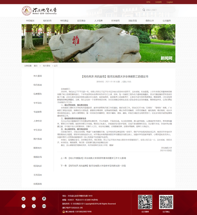 图:1月8日,学校通过新闻网发布致BB贝博艾弗森官网全体教职工的倡议书,号召全体教职工服从学校安排,强化责任担当;强化防控意识,充实居家生活;关心离校学生,履行岗位职责,携手共渡难关,共克时艰。