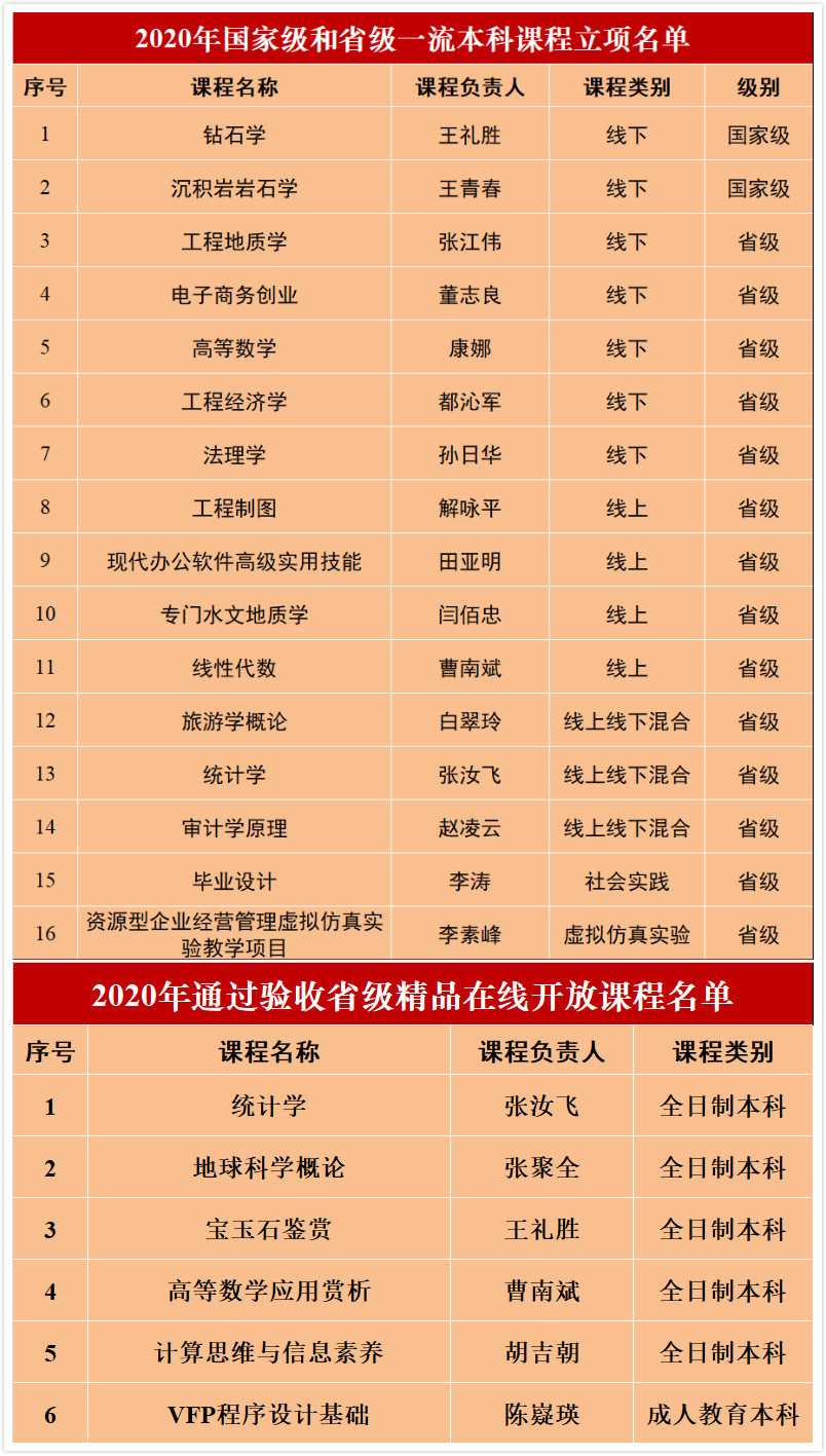 学校以课程建设为抓手,推动信息技术与教育教学深度融合,着力打造具有高阶性、创新性和挑战度的一流课程,促进了教学质量的稳步提高。2020年,“钻石学”和“沉积岩岩石学”两门课程获首批国家一流本科课程立项认定;14门课程获批省级一流本科课程立项,其中线上课程4门、线下课程 5门、线上线下混合式课程3门、社会实践课程1门、虚拟仿真课程1门;首批6门省级精品在线开放立项课程全部通过省教育厅验收,并获得“省级精品在线开放课程”称号。