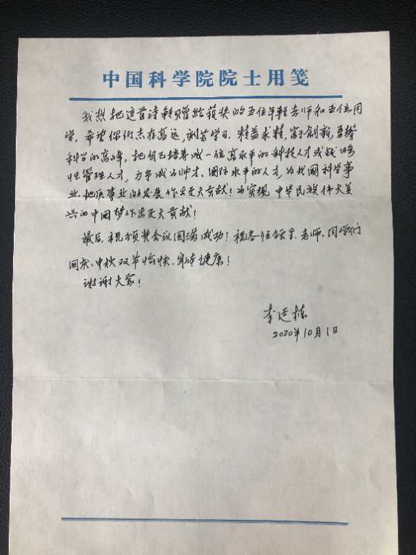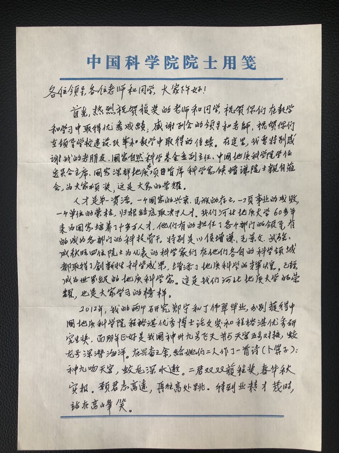 我想把这首诗转赠给获奖的五位年轻老师和五位同学,希望你们志存高远,刻苦学习,精益求精,富于创新,勇攀科学的高峰,把自己培养成为一位高水平的科技人才或战略管理人才,力争成为帅才、国际水平的人才,为我国科学事业、地质事业的发展做出更大的贡献!为实现中华民族伟大复兴的中国梦做出更大的贡献!