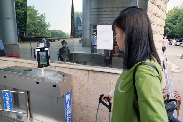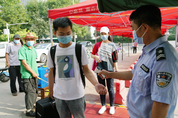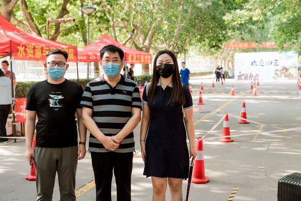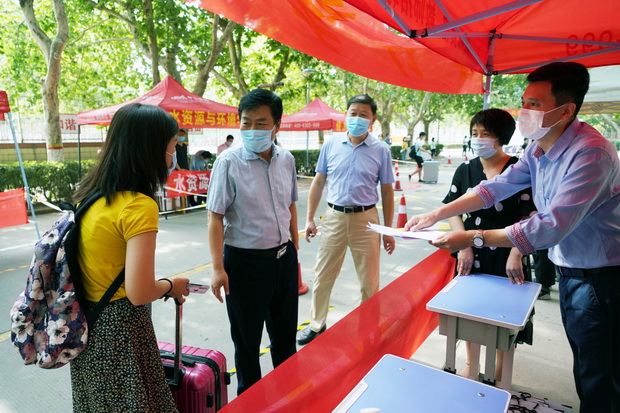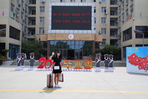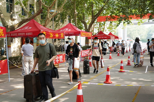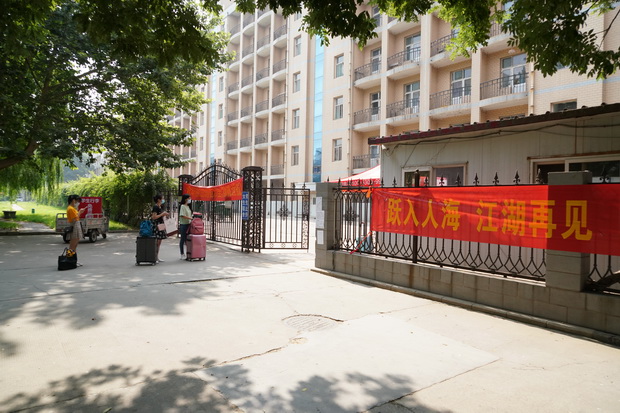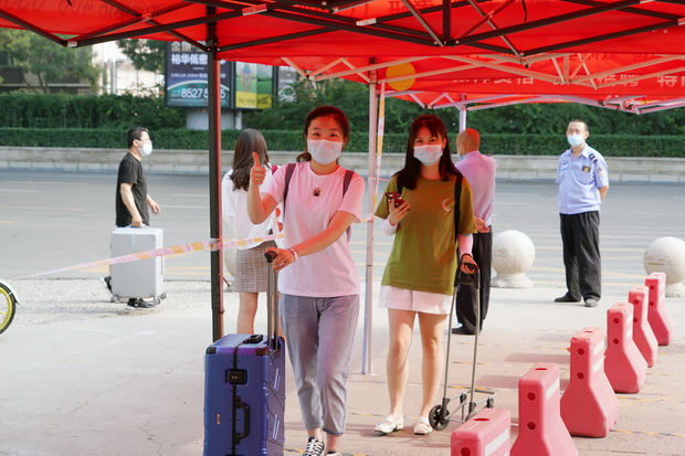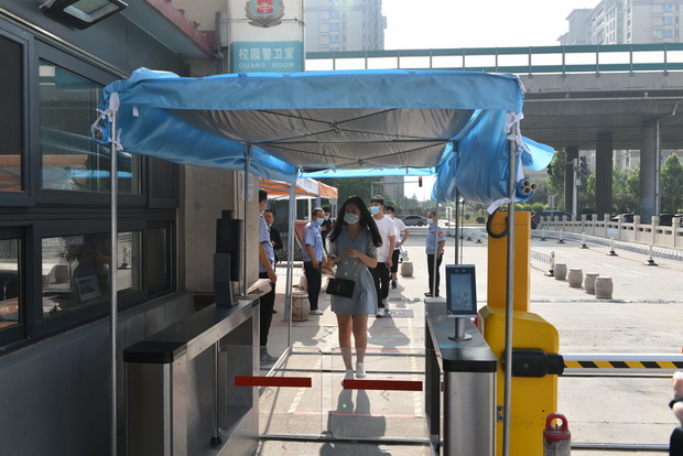 公寓前,工作人员早已等候在门口,对进入公寓的学生进行第二次体温检测。宿管阿姨也在等待孩子们的归来,一句句“欢迎回来”让时隔半年返回学校的学子们倍感温馨。