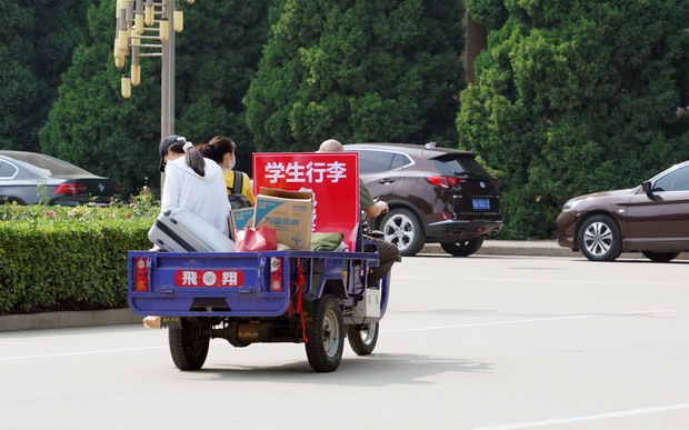 校门口早已准备好了学生返校专用通道,学生测量体温后有序进入校园,签到报道,领取学校准备的爱心包、明白卡,后勤集团专门安排电动三轮车帮助学生转运行李,更有领导老师推着自行车为学生拉送行李,处处体现了学校对毕业生的体贴和关爱。