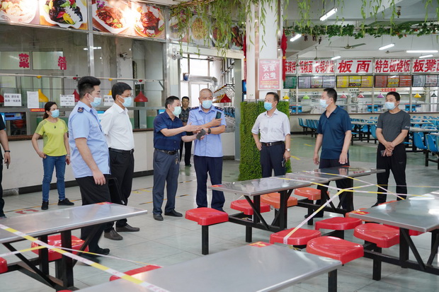 检查组查看学生食堂