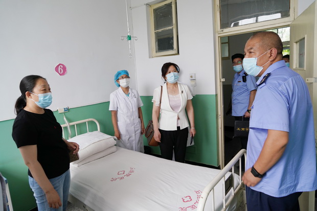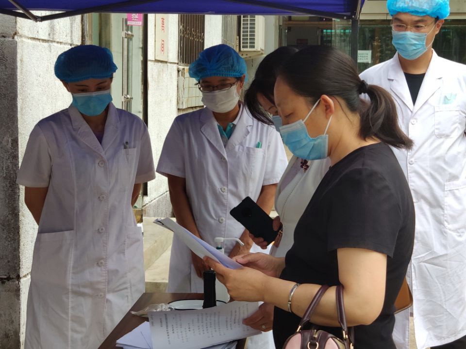 检查组走访查看校医院相关设施、查阅防控资料