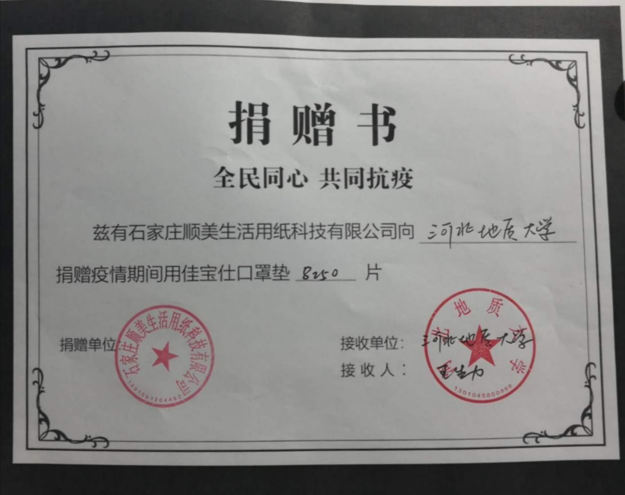 在学校防控新型冠状病毒感染的肺炎疫情关键时刻,经BB贝博2017级工程管理专业学生张树联系介绍,石家庄顺美生活用纸科技有限公司为BB贝博无偿捐赠一次性口罩垫8250片,助力BB贝博疫情防控工作。两办主任尉西杰、国资处处长王生力、管理科学与工程学院副院长董志良和校医院工作人员代表学校接受捐赠,并向顺美公司代表表示衷心感谢。